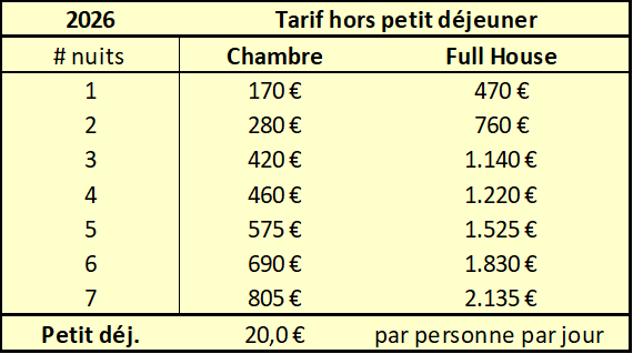 Les prix incluent loyer, linge de lit et de bain, wifi, nettoyage, TVA et taxe de séjour. Il est possible de réserver avec ou sans petit déjeuner.